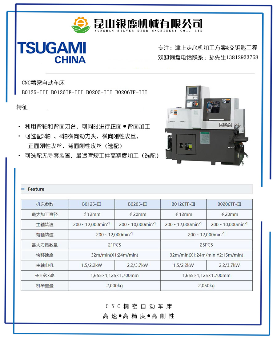 津上B0125和B0205共用床身、這款機一般情況下我們不賣:如果加工7mm以上產(chǎn)品我們建議買B0205-III價格差別不大、可加工范圍小。我們在針對1-3mm產(chǎn)品時會推薦用這款機、搭配冠通小料機使用。可以選擇配導(dǎo)套、側(cè)面動力刀頭、背軸、功能和B0205相當(dāng),同樣可以實現(xiàn)主背軸同步加工、互不干擾。